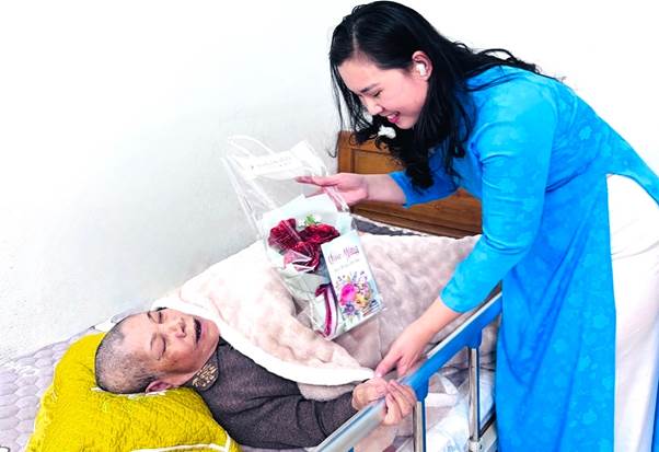 Đồng chí Nguyễn Hải Ánh, Tổ trưởng tổ nữ công, tặng quà cho thân nhân liệt sĩ đang nuôi dưỡng tại Trung tâm.
